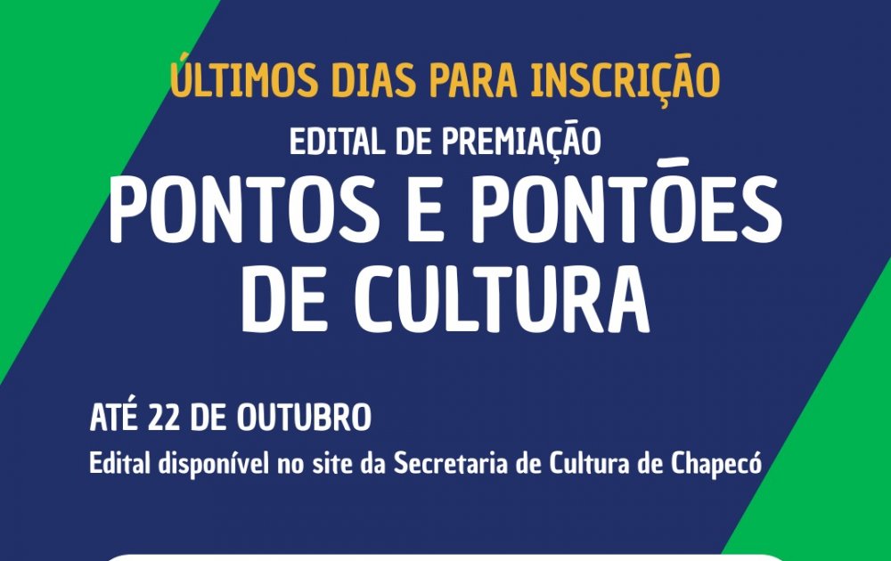 A Prefeitura de Chapecó, através da Secretaria de Cultura, informa que o prazo para as inscrições de entidades, coletivos culturais e Pontos de Cultura credenciados encerra na próxima quarta-feira. Essa é uma oportunidade valiosa para grupos que desenvolvem atividades culturais em suas comunidades.
